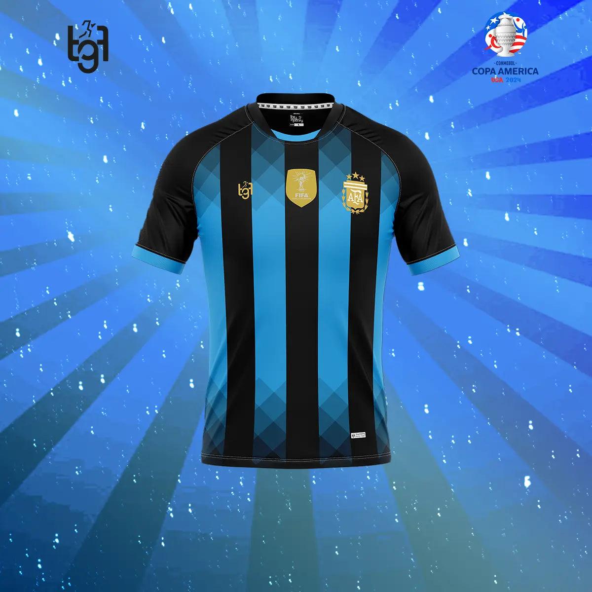 Introducing the TGF Limited Edition Argentina Jersey from the Copa America Collection. In black and light blue, it blends tradition with innovation. Crafted for peak performance, it features a breathable back mesh to keep you cool. Adorned with the Argentine crest, it's a symbol of pride and legacy. Join the ranks of champions with this stylish ode to Argentine football.